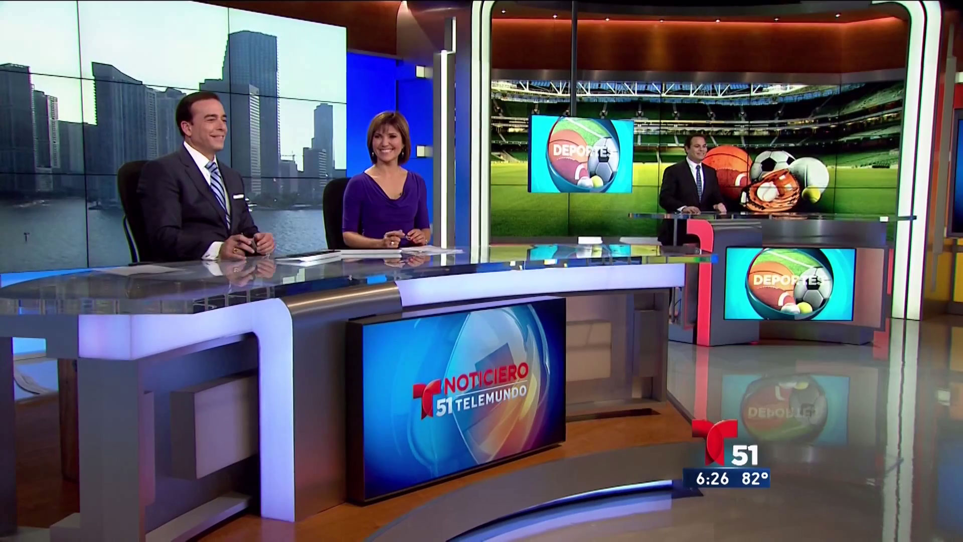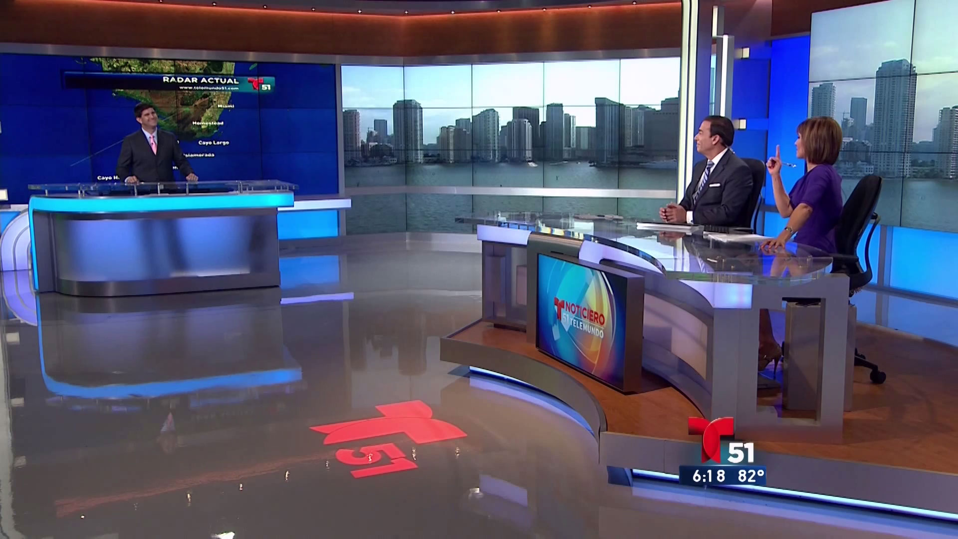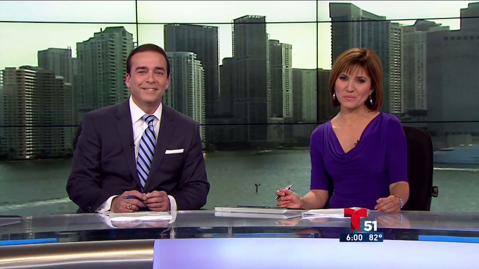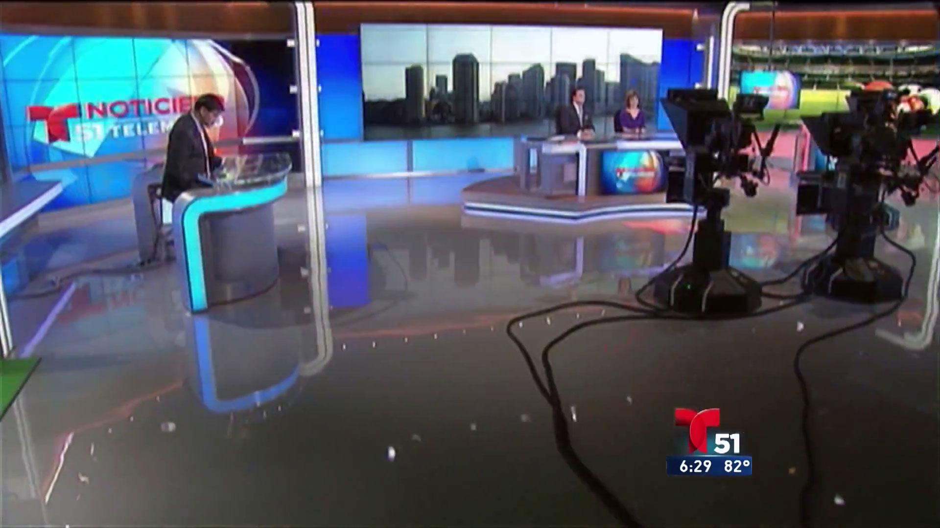 The new set features three large video walls, one used as a backdrop behind the anchors displaying a video feed of downtown Miami just like WTVJ. The other two are used as backdrops for the weather and sports areas. And a smaller video wall is used for stand up