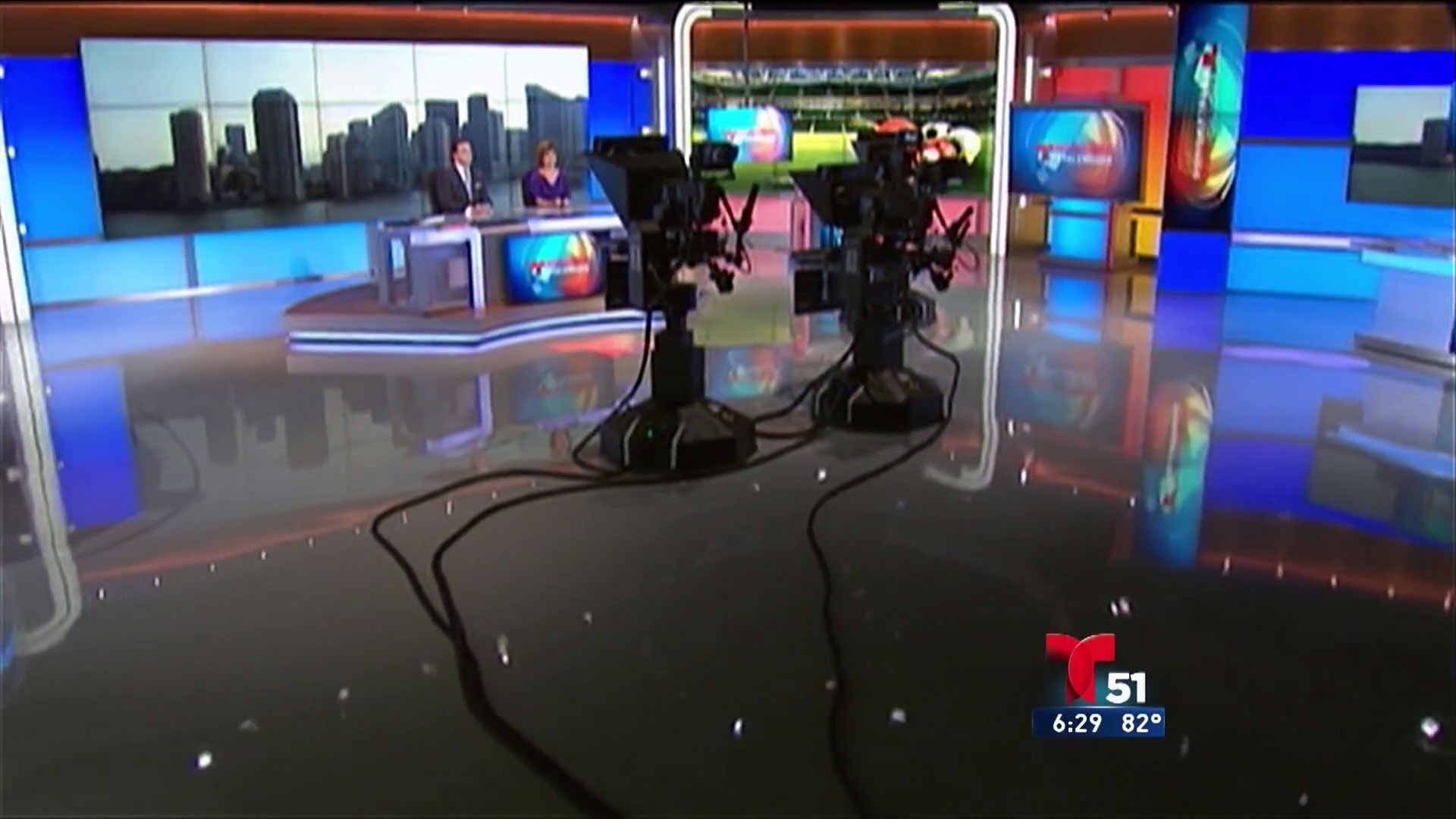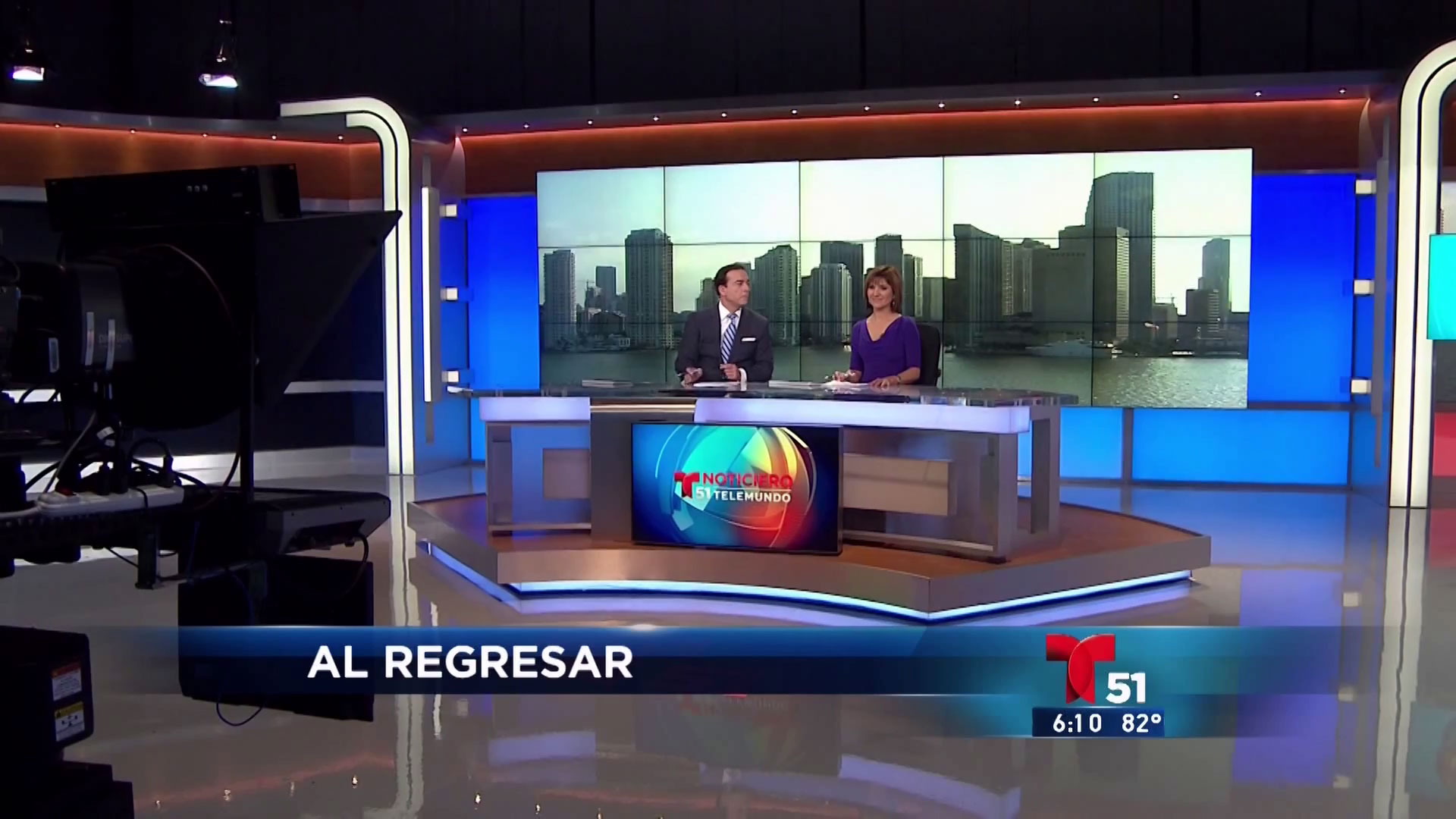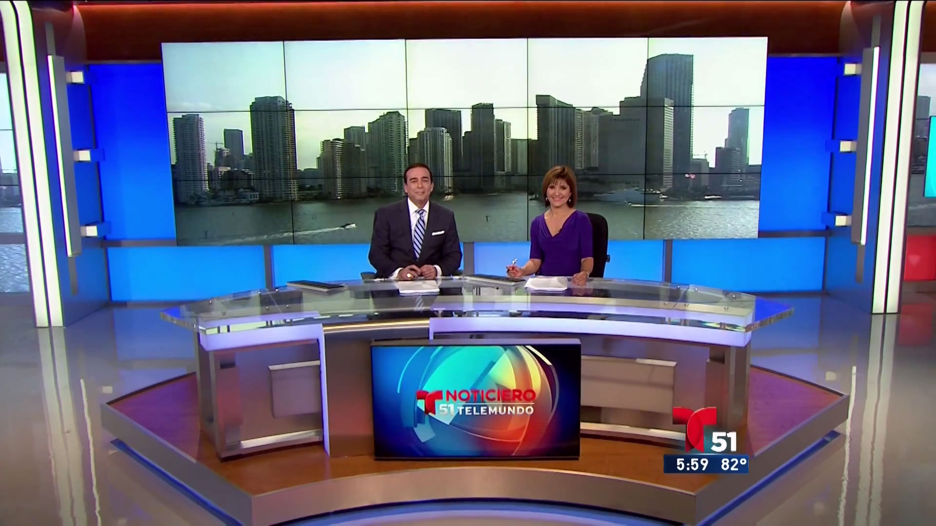 The new set features three large video walls, one used as a backdrop behind the anchors displaying a video feed of downtown Miami just like WTVJ. The other two are used as backdrops for the weather and sports areas. And a smaller video wall is used for stand up